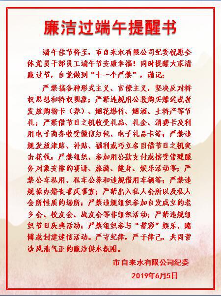 為落實(shí)城發(fā)紀委嚴明端午節期間紀律通知要求,公司紀委強化教育提醒,在微信公眾號、各工作群發(fā)布《廉潔過(guò)端午提醒書(shū)》,溫馨提醒干部職工自覺(jué)做到“十一個(gè)嚴禁”,全體紀檢人員加大督促檢查力度,開(kāi)展紀律作風(fēng)專(zhuān)項檢查,對發(fā)現的節日期間“四風(fēng)”問(wèn)題快查嚴處,凈化節日風(fēng)氣。公司領(lǐng)導在安全生產(chǎn)會(huì )重申節間紀律,各黨支部多載體多渠道傳達紀律要求,及時(shí)發(fā)放《提醒書(shū)》,并組織學(xué)習了中紀委端午節前夕曝光的六起違反中央八項規定精神典型問(wèn)題,切實(shí)筑牢廉潔防線(xiàn),嚴防“節日腐敗”、嚴肅過(guò)節紀律,確保人人廉潔、清廉過(guò)節。